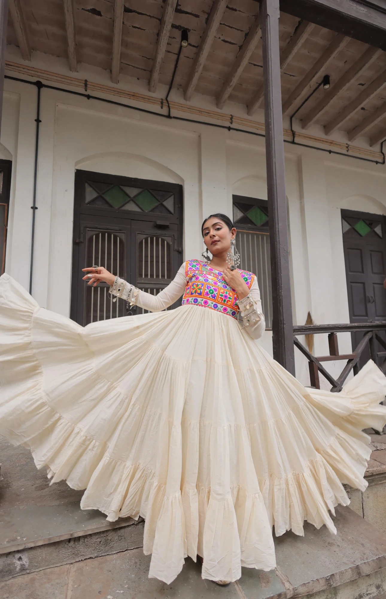 ✨ Perfect for Navratri 2025 – Elegant Off-white Gown with Gamthi Embroidery for Garba Nights & Festive Celebrations.