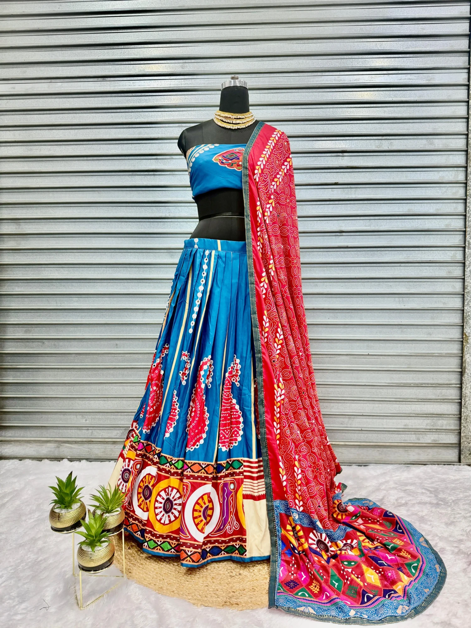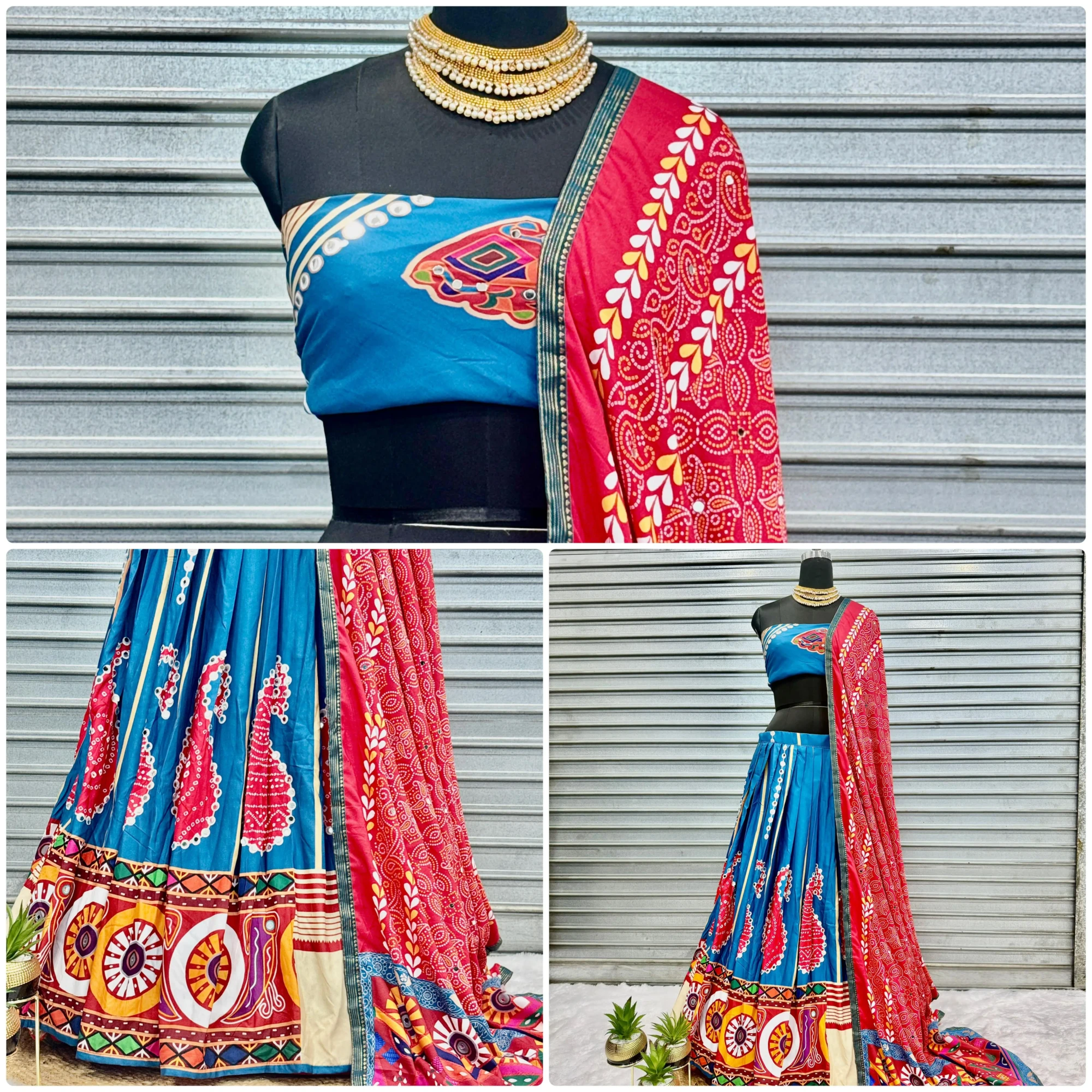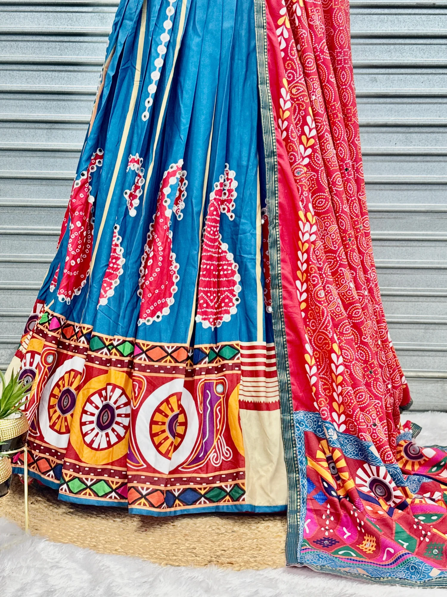 | Lehenga (Skirt) | Fabric: 100% Cotton Color: Teal Blue with Red & White Bandhani-inspired Motifs Border: Vibrant Multicolor with Tribal Wheel & Regional Design Patterns Style: Flared Traditional Lehenga with Folk Storytelling Touch |